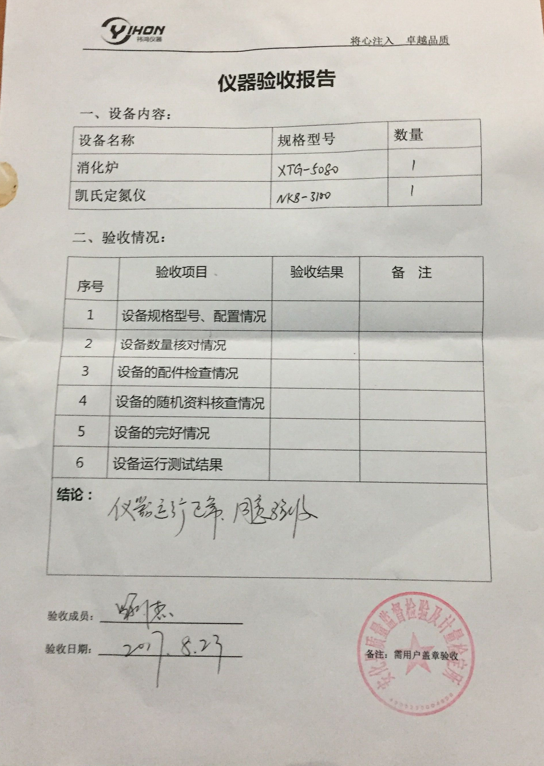 湖南安化縣質量監督檢驗計量檢定院經過嚴格選型、多方調研、輪番幾次的技術交流探討,最終上海祎鴻定氮儀以優秀的研發技術、過硬的產品質量、滿意的售后服務,被順利選中,并提供NKB3100自動凱氏定氮儀、XTG5080遠紅外碳纖維消解儀,已圓滿完成調試培訓驗收工作。