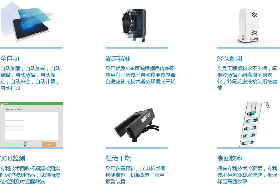 NKY6120凱氏定氮儀采用智能化程序設(shè)計,不但具有全程自動加酸、加減、稀釋和自動清洗功能,同時實現(xiàn)樣品在堿性條件下將銨鹽轉(zhuǎn)化為氨的自動蒸餾;而且在程序設(shè)定條件下通過高精度微量計量泵自動完成標準鹽酸滴定,通過RGB可編程光學傳感技術(shù)自動判定到達滴定終點,從而計算出樣品中氮的含量。該產(chǎn)品已成為食品企業(yè)、農(nóng)林漁業(yè)、高等院校、科研機構(gòu)、質(zhì)量機構(gòu)等部門的重要理化分析儀器。